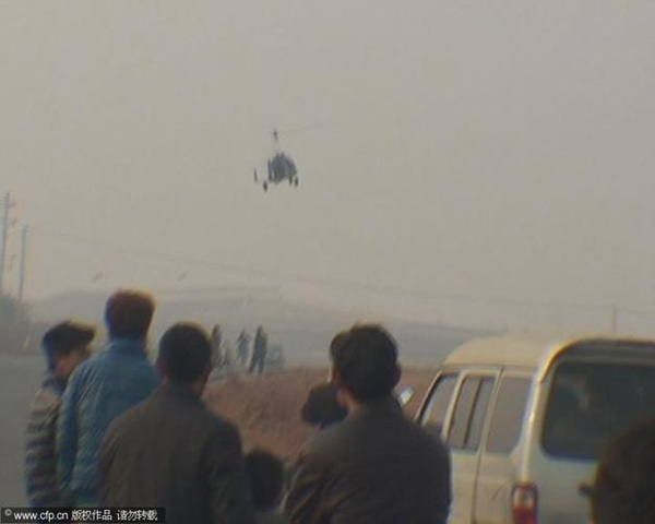 2013年02月24日,河南洛阳,正月十五元宵节,一小伙开一架自己制造的直升飞机前去伊川的一庙会玩,引数万观众围观。据悉,这架自制飞机总共花费六七十万元,这已是他的第三架飞机了。