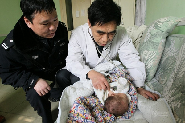 医生给男婴听诊。